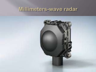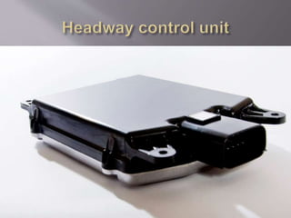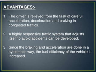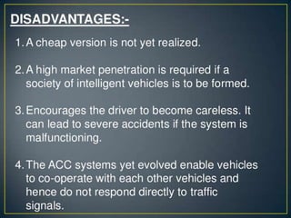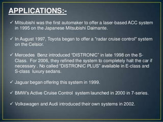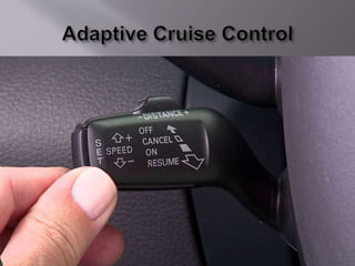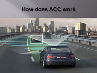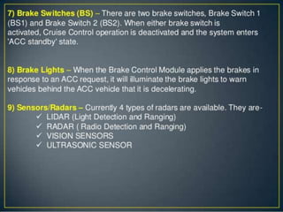 The document discusses the components and functions of an adaptive cruise control system. It explains that the adaptive cruise control module processes radar information to detect vehicles and define speed. The engine control module communicates with the adaptive cruise control module. The brake control module slows the vehicle when requested by applying brakes individually. The instrument cluster sends switch information to the modules. Questions at the end ask about the principle, components, advantages, disadvantages and features of adaptive cruise control.