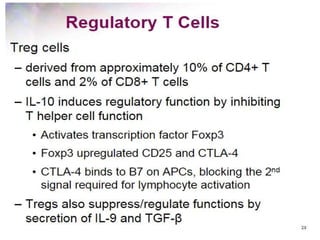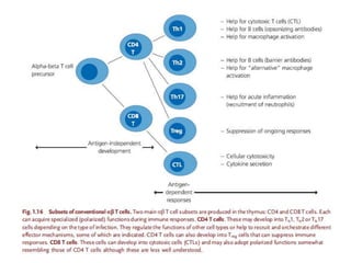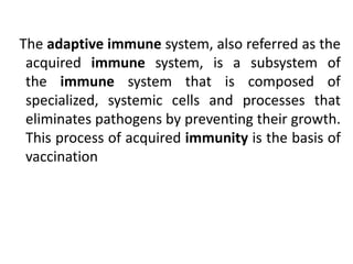 The adaptive immune system eliminates pathogens through specialized cells and processes. It has two main responses - humoral mediated by antibodies from B cells, and cell mediated by T lymphocytes. Adaptive immunity is specific, diverse and develops immunological memory allowing faster responses. It involves lymphocytes, antigen presenting cells, and effector cells working together precisely eliminate pathogens.