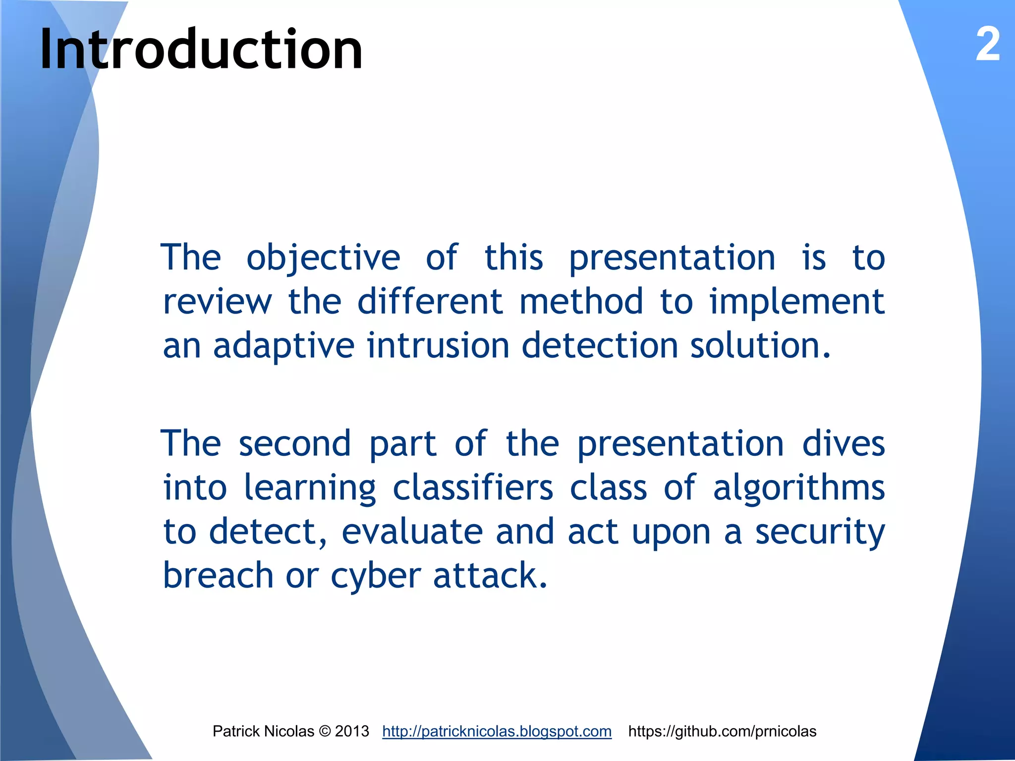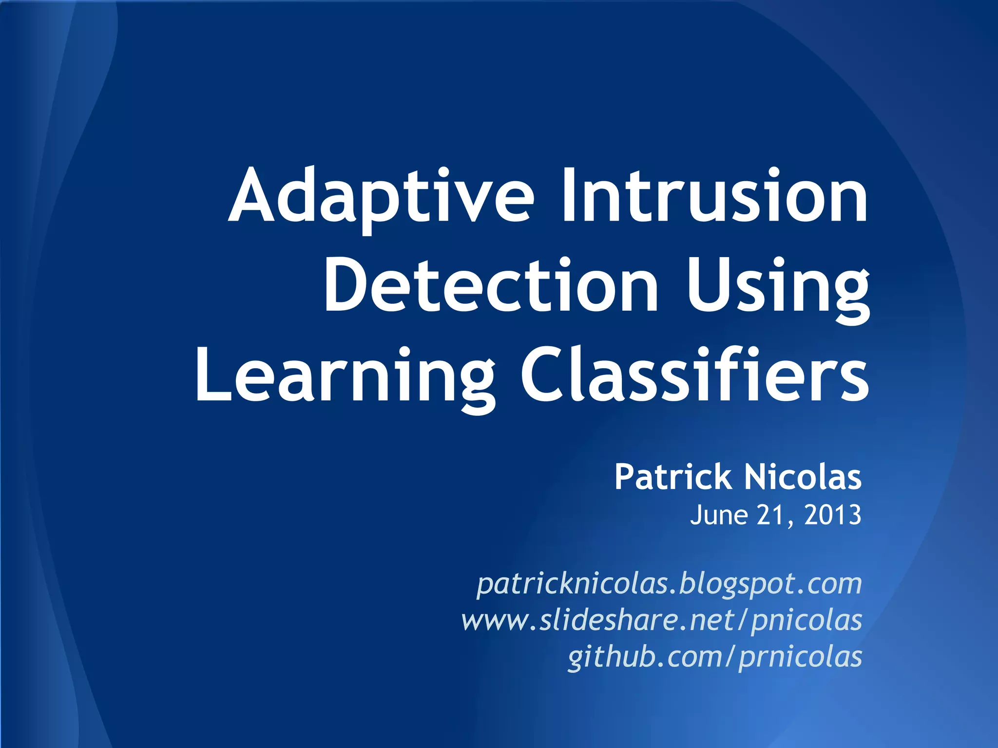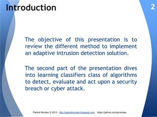 The document discusses using learning classifiers and genetic algorithms to implement an adaptive intrusion detection system. Traditional data mining techniques are limited in their ability to adapt to changing environments, but learning classifiers systems combine genetic algorithms and reinforcement learning to discover and evolve security policies and rules from real-time data. The rules are represented as genes and evolved over time through processes of crossover, mutation, and selection to accurately identify threats.