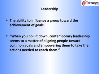 The document discusses situational leadership, emphasizing the need for leaders to adapt their style based on the developmental level and commitment of their followers. It outlines key leadership traits, skills required, and various styles such as directing, coaching, supporting, and delegating. Additionally, it highlights the importance of understanding the relationship between leaders, followers, and the environment to effectively influence and motivate teams.
