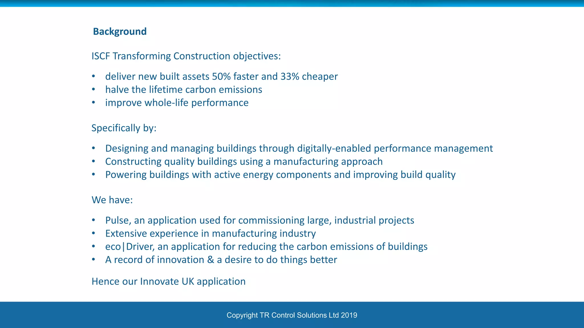 The document outlines an Innovate UK project aimed at transforming construction through adaptive learning to achieve zero defects, led by TR Control Solutions Ltd in partnership with Anglia Ruskin University. Key objectives include delivering built assets faster and cheaper, halving carbon emissions, and improving performance, by focusing on error prevention and efficient management processes. A feasibility study for this project was conducted over 12 months, with an invitation for construction companies to get involved.