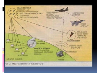 The document discusses adaptive missile guidance using GPS. It begins with an introduction to missile guidance and concepts. It then discusses different types of missile guidance including radar signals, wires, lasers, and most recently GPS. It provides details on how missile guidance using radar signals works and its limitations. It introduces GPS and describes its elements and working. It discusses how satellite guided weapons like JDAM use GPS and inertial navigation for guidance. It explains the design of weapons that use DGPS, GPS and inertial guidance to provide circular error probabilities of 40 feet or less. It concludes with applications of GPS including navigation, timing, ranging and tracking locations.