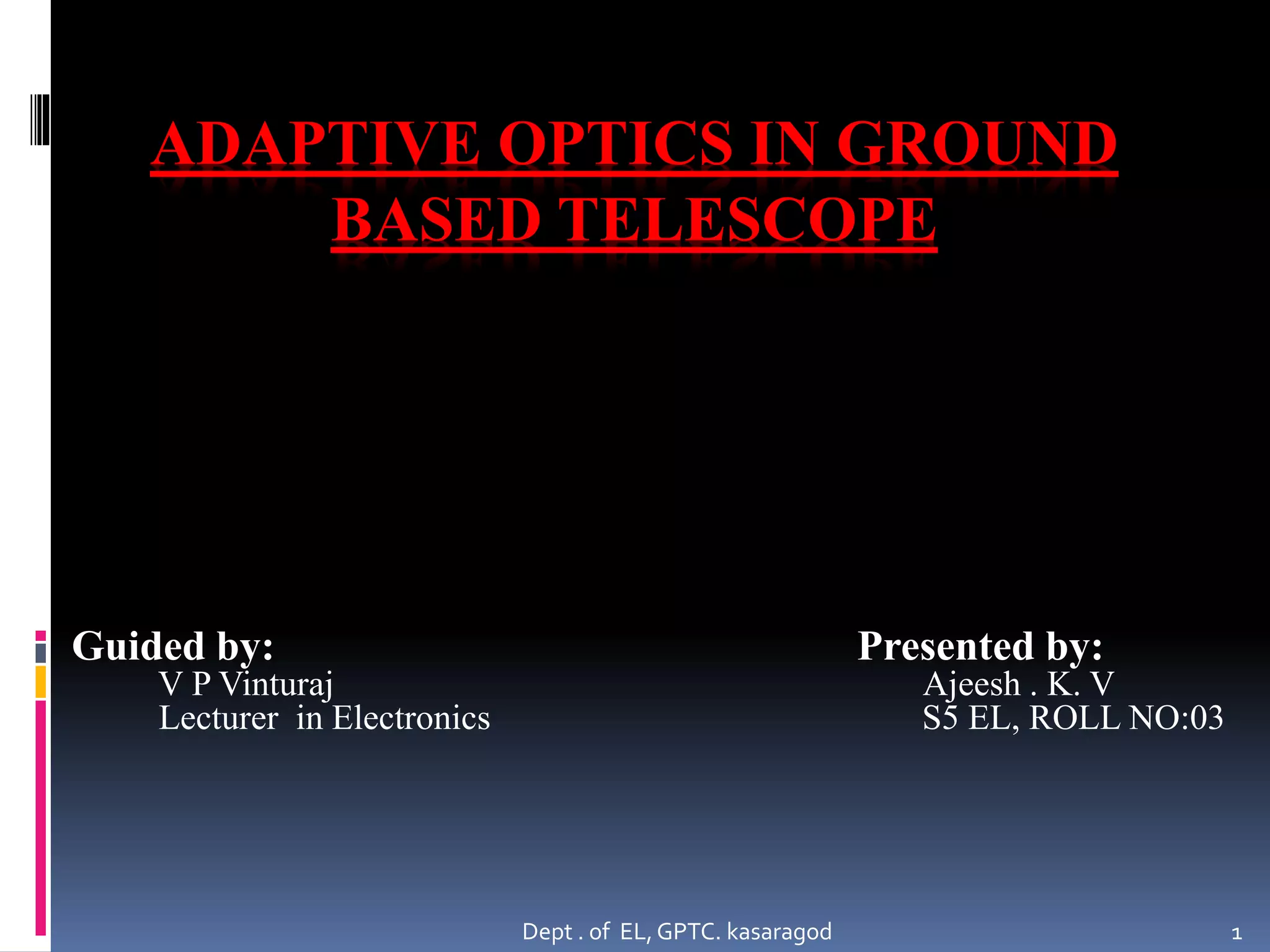 This document discusses adaptive optics in ground-based telescopes. It begins by explaining that adaptive optics helps remove atmospheric distortions to provide clearer images from telescopes on Earth. It then describes the three main types of telescopes - optical, reflecting, and radio telescopes. The document focuses on how adaptive optics works, using a deformable mirror and wavefront sensor to counteract distortions in real time. It discusses challenges like developing sensitive infrared detectors and fast adaptive components to enable observing faint exoplanets and other celestial objects.