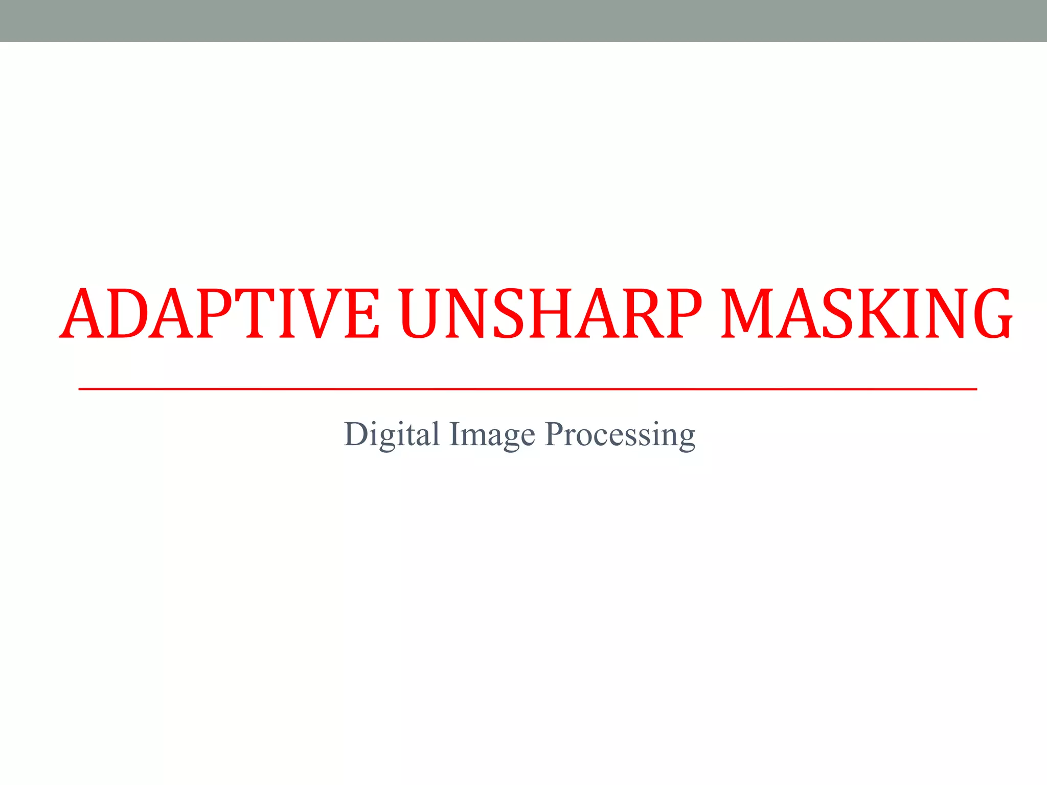 Unsharp masking (USM) is an image processing technique that enhances detail by increasing edge contrast through a high-pass filter. The adaptive unsharp masking approach aims to minimize overshoot artifacts by emphasizing medium-contrast details while being robust against noise in smooth areas. This method uses an iterative adaptation algorithm to optimize scaling factors for correction signals, improving local dynamics in images.