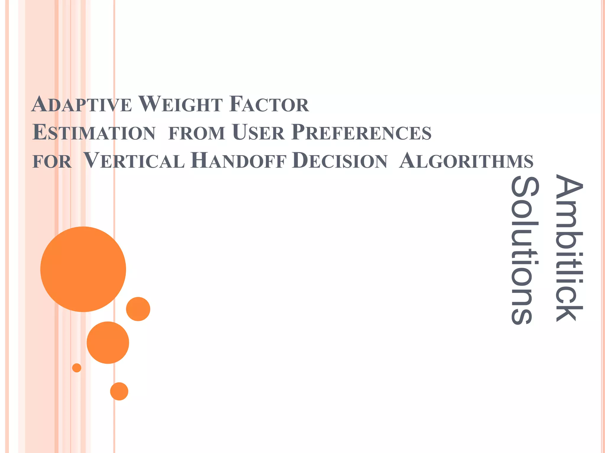 This document proposes a novel technique called Adjacent Pair Priorities (APP) to estimate weight factors for quality of service parameters in vertical handoff decision algorithms. The APP technique allows users to set relative priority levels for adjacent pairs of QoS parameters in descending order using an exponential mapping. This adaptive approach controls the width of the weight distribution to provide flexibility for users. The document outlines the system requirements, block diagram, modules and references several research papers on vertical handoff decision schemes and network selection algorithms.