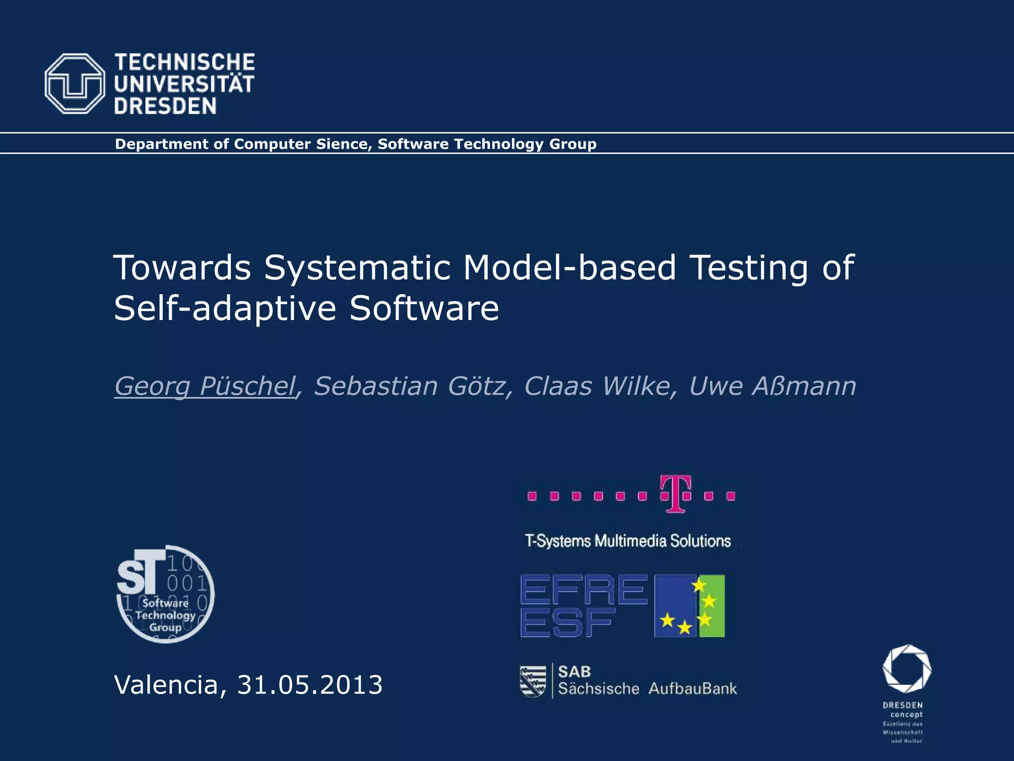 This document discusses model-based testing of self-adaptive software systems. It begins by motivating the need for new testing methods for these complex systems. It then performs a failure analysis to develop a failure domain model and fault dependency graph. From this, it derives 6+1 requirements that testing of self-adaptive systems should assure. Finally, it discusses future work in instantiating the requirements for specific projects and developing appropriate testing models and coverage criteria.