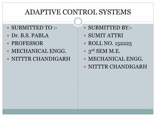 This document discusses adaptive control systems for machining. It begins by defining adaptive control as a feedback system that automatically adjusts machining variables like cutting speed and feed rate based on actual process conditions. It describes the identification, decision, and modification functions of adaptive control systems. The document classifies adaptive control systems into those with optimization, those with constraints, and geometric adaptive control. It outlines the basic structures and examples of these different types of adaptive control systems and discusses their benefits and limitations.