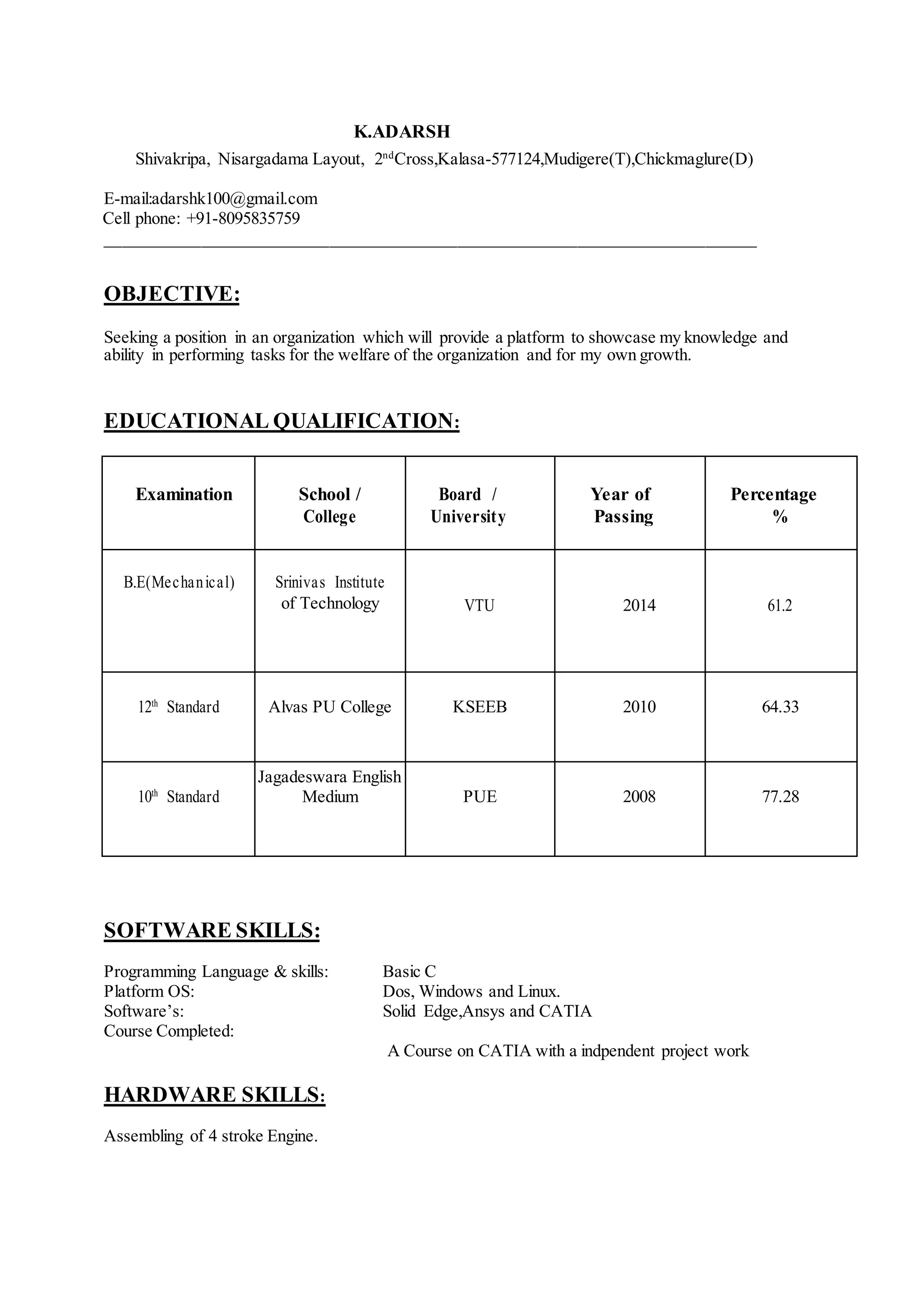 K. Adarsh is seeking a position that allows him to utilize his knowledge and skills. He has a B.E. in Mechanical Engineering from Srinivas Institute of Technology. His skills include programming in C, using CAD software like Solid Edge and CATIA, and assembling engines. He completed projects on a six-stroke engine and robotics. Adarsh worked as a Quality Engineer and Quality Incharge at automotive component manufacturing companies, handling tasks like inspection, calibration, complaint resolution, and documentation. He is looking to contribute to an organization's growth through his qualifications and industrial experience.