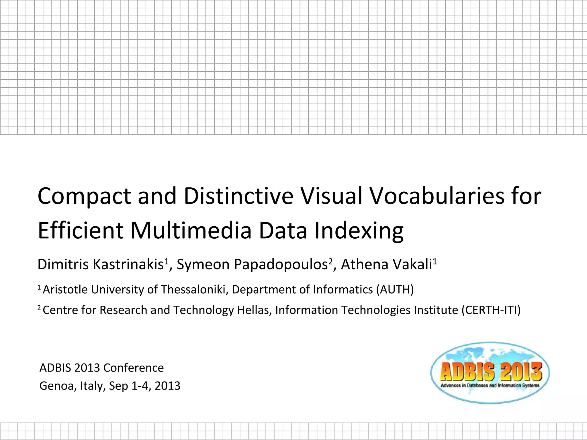 The document presents a conference paper on enhancing multimedia data indexing through the innovative concept of composite visual words (cvw), which significantly reduces the number of required visual words while maintaining high retrieval performance. This approach was validated using standard datasets (Oxford and Paris buildings), showcasing that a much smaller vocabulary can achieve similar accuracy levels compared to methods using larger vocabularies. Future work is suggested to further test this methodology on larger datasets and explore alternative filtering strategies.
