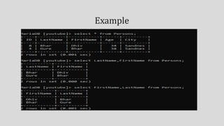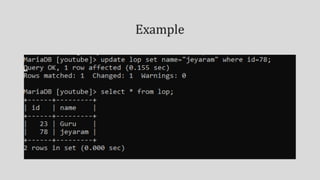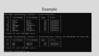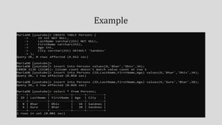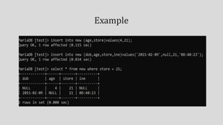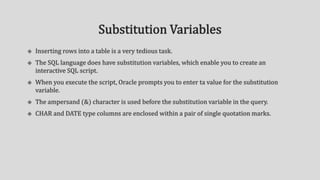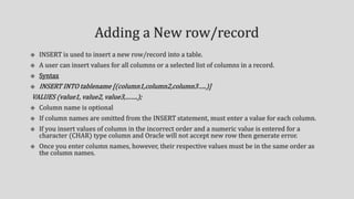 Implicit and explicit methods are used to insert null or empty values into columns. Relational operators compare values and return true or false based on equal, not equal, greater than, less than comparisons. Logical operators return true if conditions joined by AND, OR, or NOT are met. Values can be sorted in ascending order based on their type as either lowest to highest numeric, alphabetical character, or earliest to latest date.