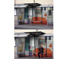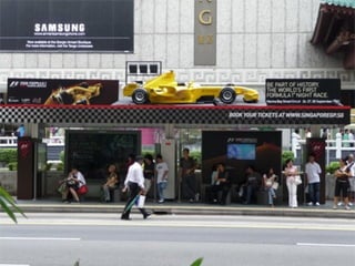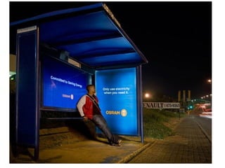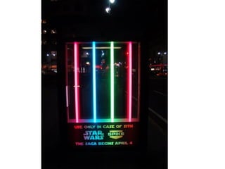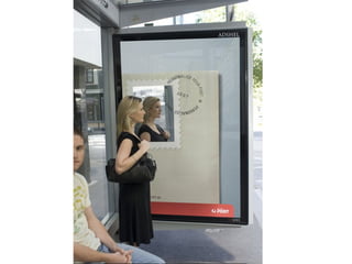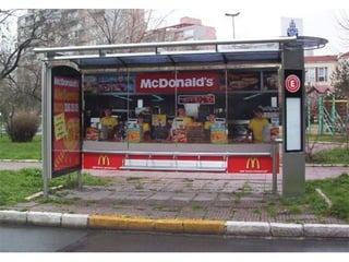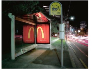 The document describes several creative advertisements displayed at bus stops around the world. Some examples mentioned include a McDonald's advertisement featuring a couch placed inside a bus stop in Istanbul, a Simpsons movie advertisement in Germany, and a Star Wars advertisement featuring fake lightsabers instead of the usual ad space. The bus stop advertisements showcase creative ways that companies can utilize the space to promote their brands in an engaging manner.