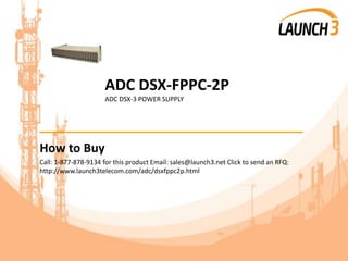 This document provides information about purchasing an ADC DSX-FPPC-2P power supply from Launch 3 Telecom. Launch 3 Telecom is a telecom equipment supplier and repair service that offers this ADC power supply as well as services including installation, de-installation, testing, repair, and asset recovery. Payment options including credit cards, purchase orders, and government purchase are accepted for orders, which can be shipped same-day via carriers like UPS if ordered before 3PM EST.
