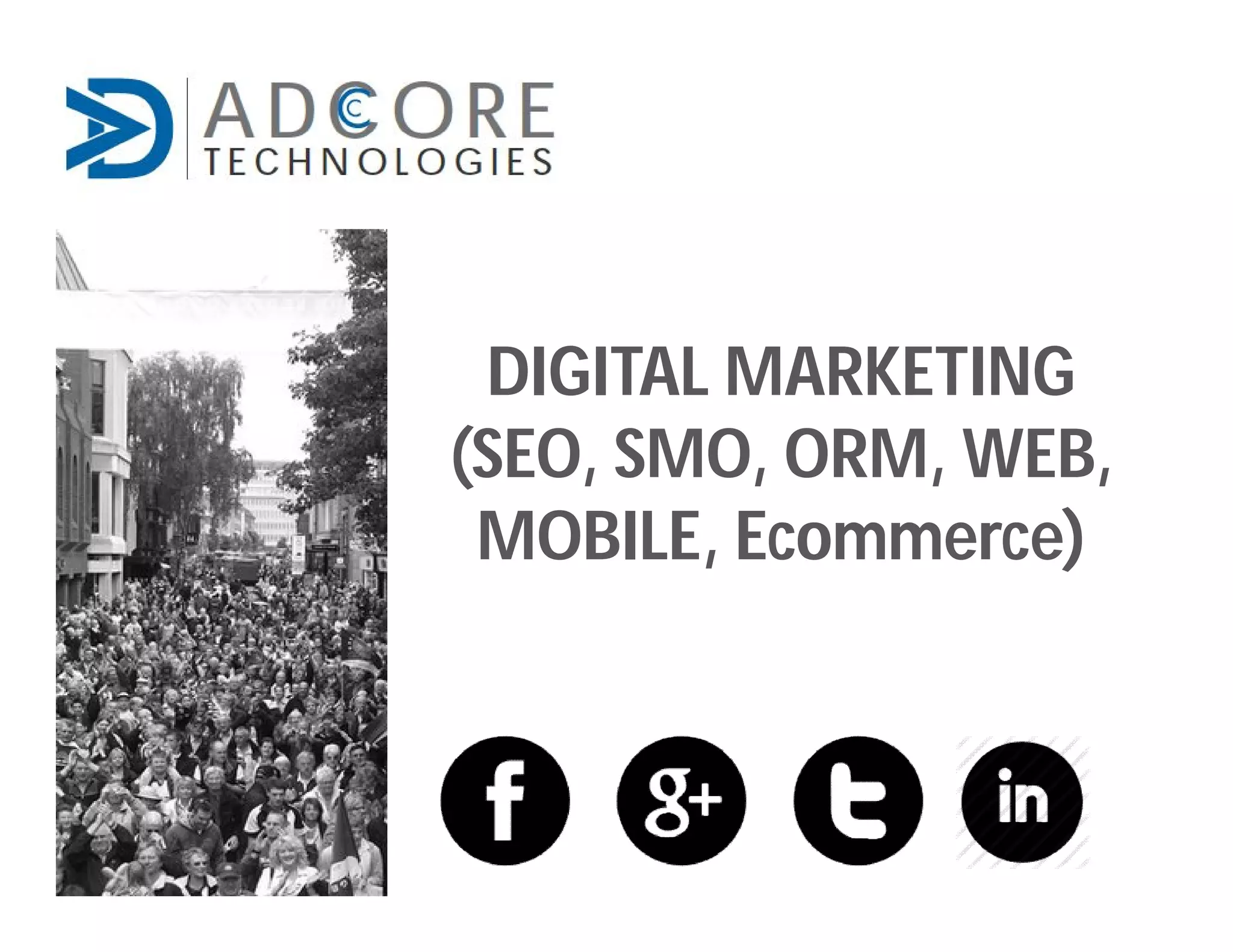 This document provides an overview of digital marketing services from Adcore Technologies including search engine optimization (SEO), social media optimization (SMO), and pay-per-click (PPC) advertising. It discusses how search engines and digital marketing have evolved over time, defines key terms like SEO, and provides guidance on developing strategies for SEO, blogs, news/PR, social media, and measuring results. The document is intended as a guide for businesses to optimize their online visibility and marketing through various digital channels.