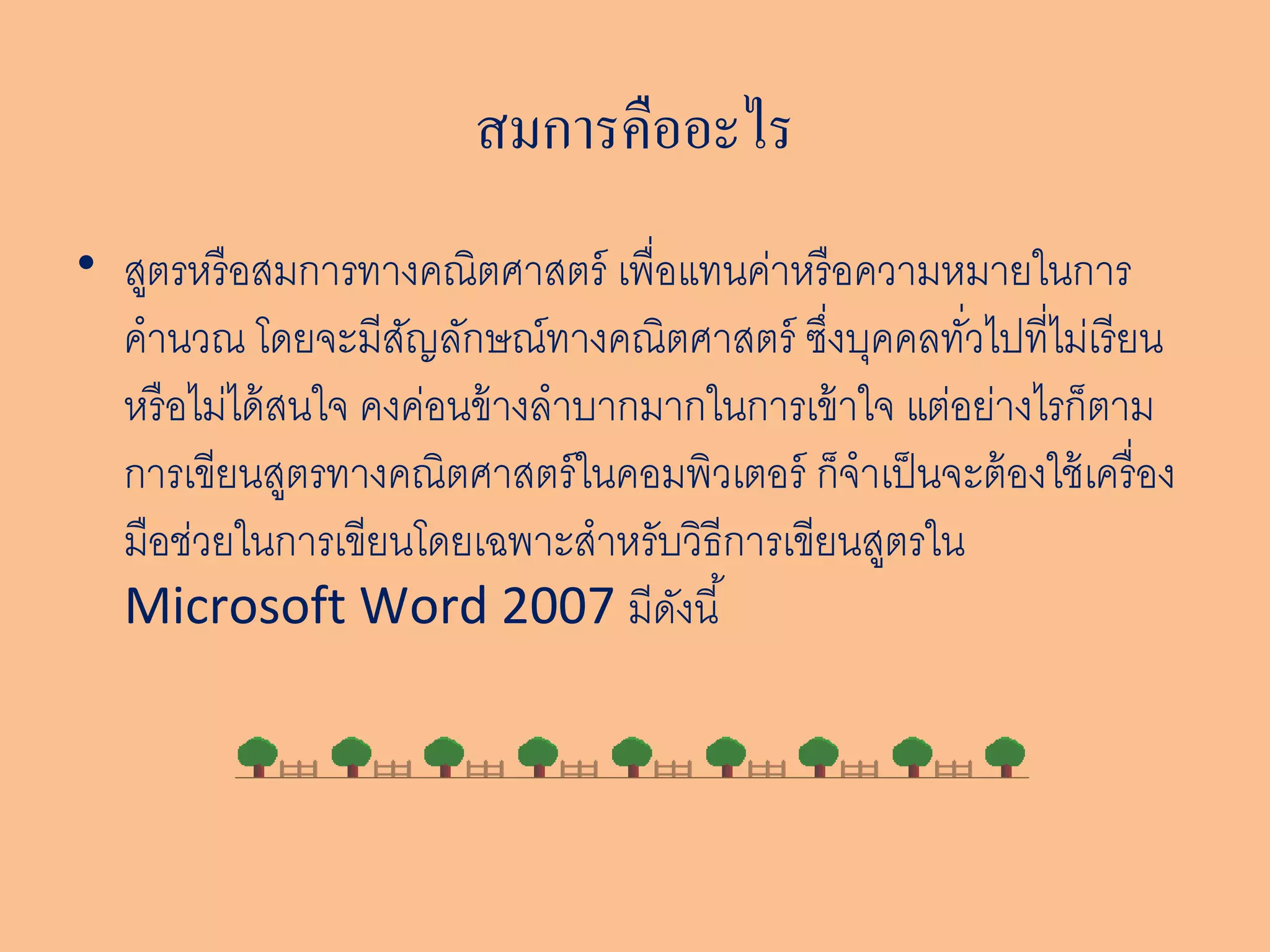 เพื่อแทนค่าหรื อความหมายในการ คำานวณ โดยจะมีสญลักษณ์ทางคณิตศาสตร์ ซึงบุคคลทัวไปที่ไม่เรี ยน ั ่ ่ หรื อไม่ได้ สนใจ คงค่อนข้ างลำาบากมากในการเข้ าใจ แต่อย่างไรก็ตาม การเขียนสูตรทางคณิตศาสตร์ ในคอมพิวเตอร์ ก็จำาเป็ นจะต้ องใช้ เครื่ อง มือช่วยในการเขียนโดยเฉพาะสำาหรับวิธีการเขียนสูตรใน Microsoft Word 2007 มีดงนี ้ ั