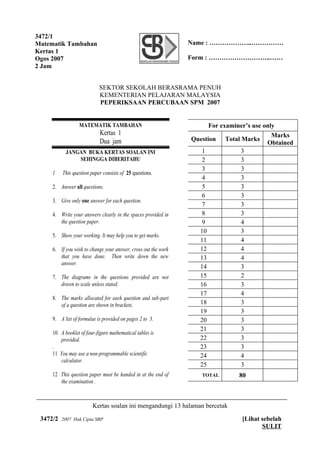 This 25 question mathematics additional paper consists of questions testing students' knowledge of algebra, calculus, geometry, statistics, trigonometry and their applications. The first few questions test concepts such as relations between sets, composite functions, and solving quadratic equations. Later questions involve more complex skills like expressing logarithmic functions, solving trigonometric and logarithmic equations, and finding parameters from graphs. Students are required to show their working, write answers to an appropriate degree of accuracy, and provide unit vectors when calculating distances between points.