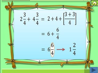 This document provides examples for adding mixed numbers with the same denominators. It shows how to circle the common denominators, add the whole numbers, and then add the numerators of the proper fractions. Examples are provided for adding two and three mixed numbers together. Review questions are included at the end to test understanding.