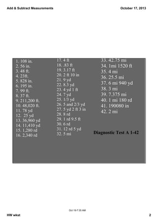 This document provides instruction and practice problems for adding and subtracting measurements. It begins with an objective to work on adding and subtracting measurements. Examples are then given for how to add measurements by combining like units such as feet and inches. Students are provided practice problems to add various measurements involving feet, inches and yards. The document also covers subtracting measurements, giving examples of how to simplify answers. Students are given subtraction practice problems involving feet, inches and yards. The document concludes by assigning measurement addition and subtraction as homework.