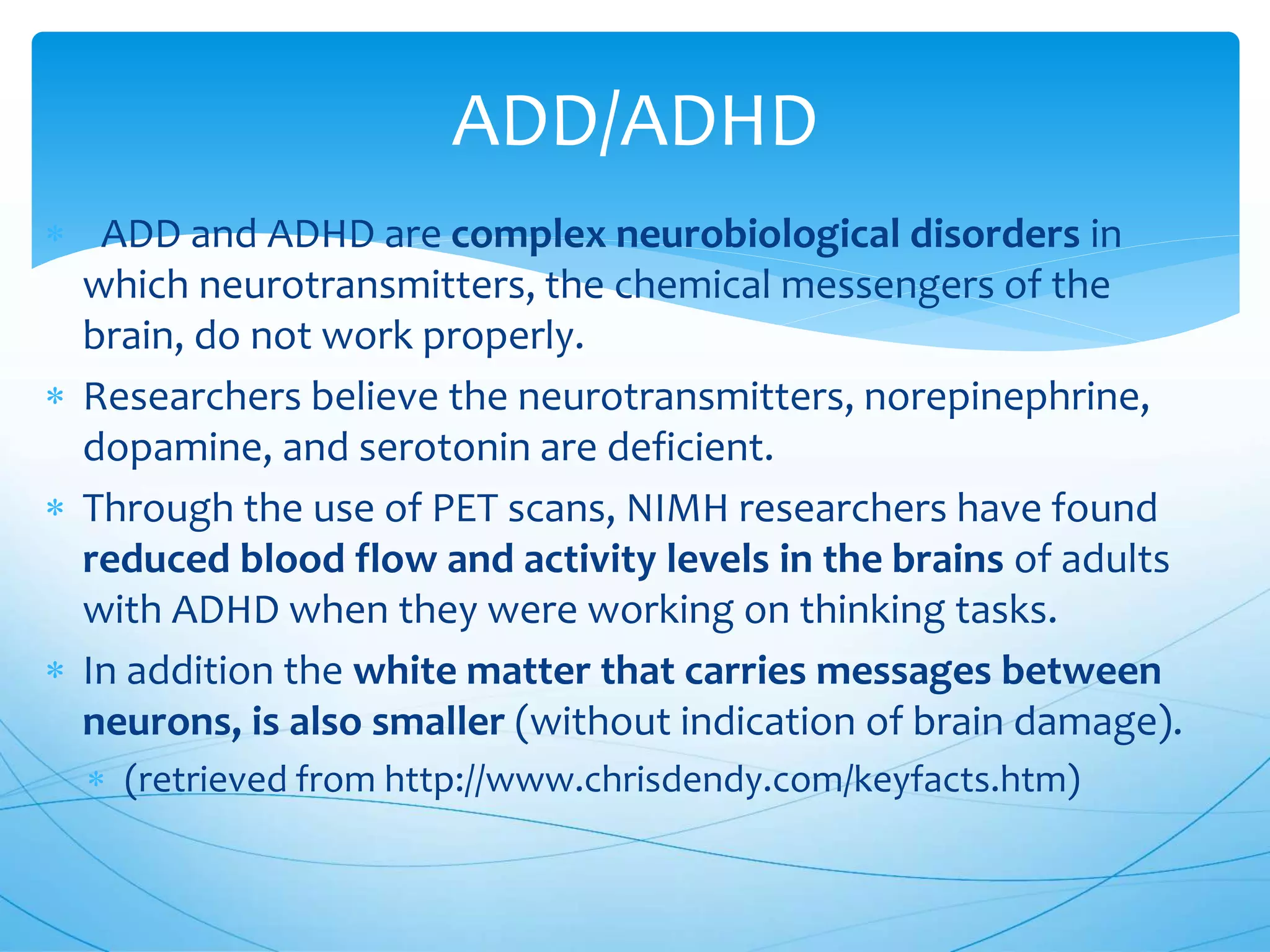 The document discusses ADD and ADHD as complex neurobiological disorders linked to neurotransmitter deficiencies, particularly norepinephrine, dopamine, and serotonin. Key symptoms include inattention, hyperactivity, and impulsivity, with diagnosis primarily based on observed behaviors rather than definitive tests. The document also highlights potential causes such as genetic factors, prenatal exposure to toxins, and various medical conditions that can mimic ADHD symptoms.