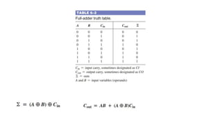 The document discusses the concepts of half and full adders in binary addition, describing how half adders generate a sum and carry bit from two binary inputs, while full adders also include an input carry. It introduces half and full subtractors for binary subtraction operations, and explains how they generate difference and borrow outputs. Additionally, it covers the implementation of parallel binary adders and their expansion to handle larger bit numbers, differentiating between ripple carry and look-ahead carry mechanisms.
