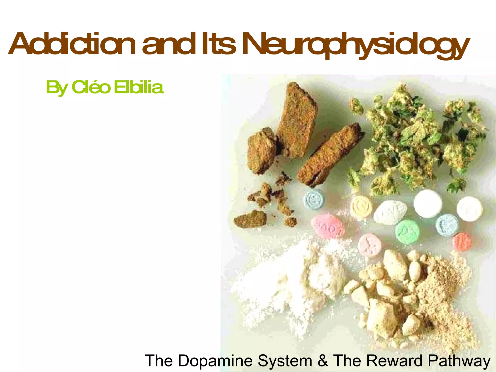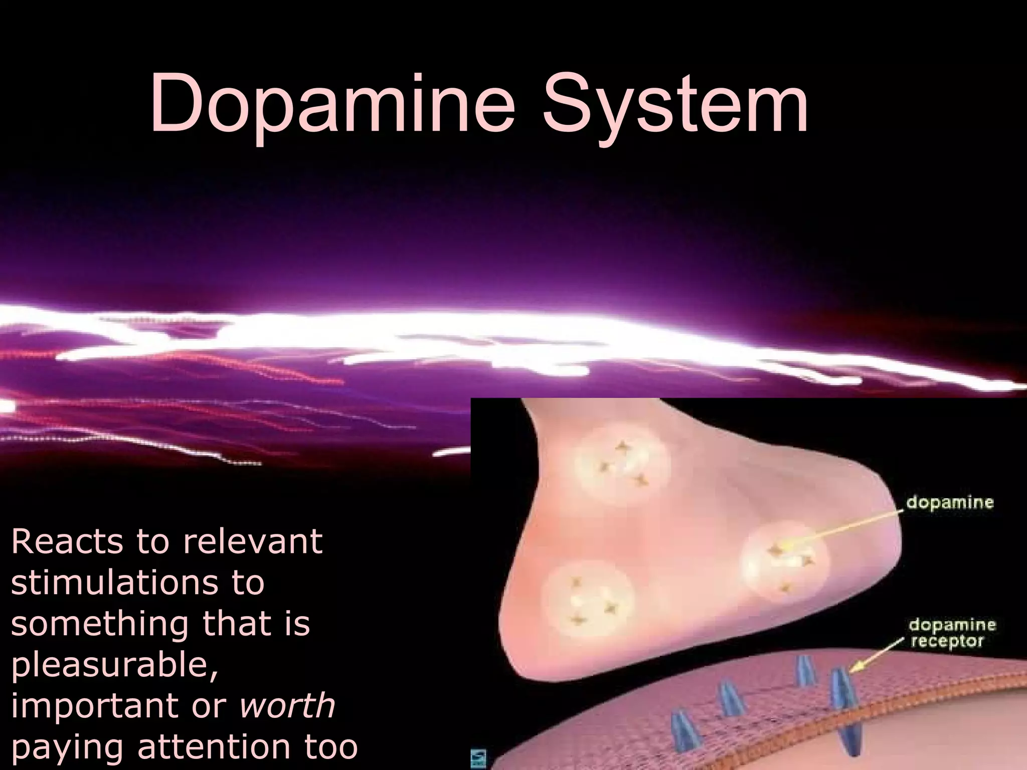 The document discusses how the dopamine system and reward pathway in the brain are related to addiction. When stimulated by something pleasurable, the dopamine system reacts to bring attention to the stimulus. Repeated stimulation causes the brain to need more of the substance or activity to feel pleasure as the stimuli become less salient. This can lead to addiction as the user needs higher amounts to activate the reward pathway and feel the effects.