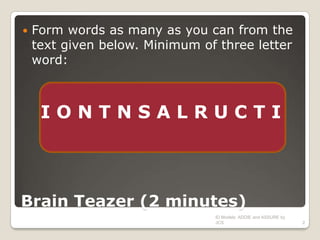 This document discusses instructional design models and how they can be used to achieve quality teaching. It introduces the ADDIE and ASSURE instructional design models. The ADDIE model includes the phases of analysis, design, development, implementation, and evaluation. The ASSURE model focuses on analyzing learners, stating objectives, selecting methods/media, requiring learner participation, evaluating and revising instruction. The document provides information about each phase of the models and encourages participants to apply the models to create instructional plans.
