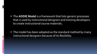 The ADDIE model is an instructional design framework consisting of 5 phases - Analysis, Design, Development, Implementation, and Evaluation. It was originally developed for the US Army to provide a flexible guideline for building effective training tools. The phases can be iterative and not strictly linear. Analysis involves determining learning objectives and needs. Design develops instructional plans and content. Development creates materials and media. Implementation delivers and tests the instruction. Evaluation assesses effectiveness throughout and after the process.