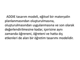 Tasarımcısı ADDIE modelini kullanır. ADDIE, bir