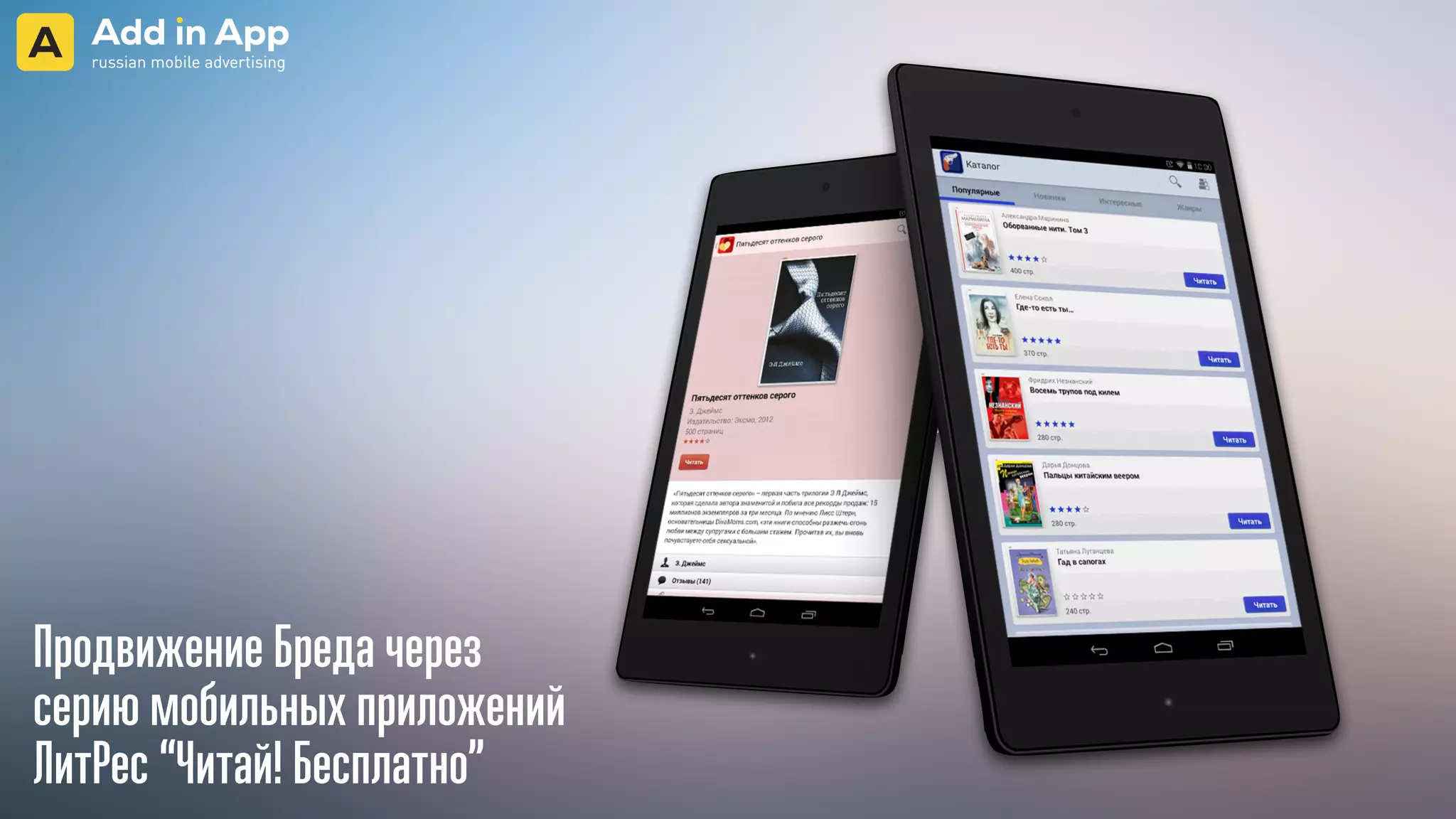 Документ описывает стратегию продвижения бренда через серию мобильных приложений 'читай! бесплатно' от ЛитРес, которые занимают 60% рынка электронных книг и аудиокниг в России. Приложения предлагают различные форматы баннерной рекламы и механики взаимодействия с пользователями, что обеспечивает более 95 миллионов контактов с потенцальной аудиторией. Также выделены интересы различных целевых аудиторий и доступные опции для графического брендирования в приложениях.