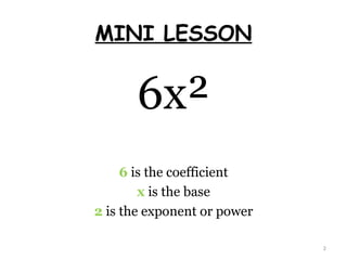 The document provides instructions on how to add and subtract monomials. It defines key terms like coefficient, base, exponent, degree of a monomial, degree of a polynomial, and like terms. It explains that to add monomials, you add the coefficients and keep the base, and to subtract monomials you subtract the coefficients and keep the base. Examples are given of simplifying expressions by combining like terms.