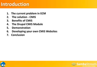 The document discusses integrating Enterprise Content Management (ECM) with Drupal using CMIS (Content Management Interoperability Services) to enhance document management capabilities. It outlines the benefits of CMIS, including simplified application development and independence from content management repositories, and details various Drupal CMIS modules. The document also provides installation instructions and hooks for developers to customize their CMIS integration with Drupal.