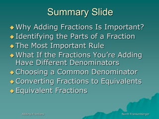 This document provides instruction on adding fractions with different denominators. It begins by explaining why understanding fractions is important for success in algebra and beyond. It then defines the key parts of a fraction and establishes the important rule that fractions can only be added if they have a common denominator. The document demonstrates how to find the lowest common denominator and convert fractions to equivalent forms with the common denominator in order to add them. It emphasizes that equivalent fractions allow fractions to retain their original value even when the denominator changes.