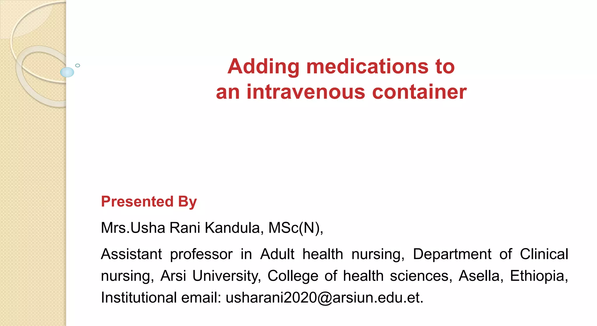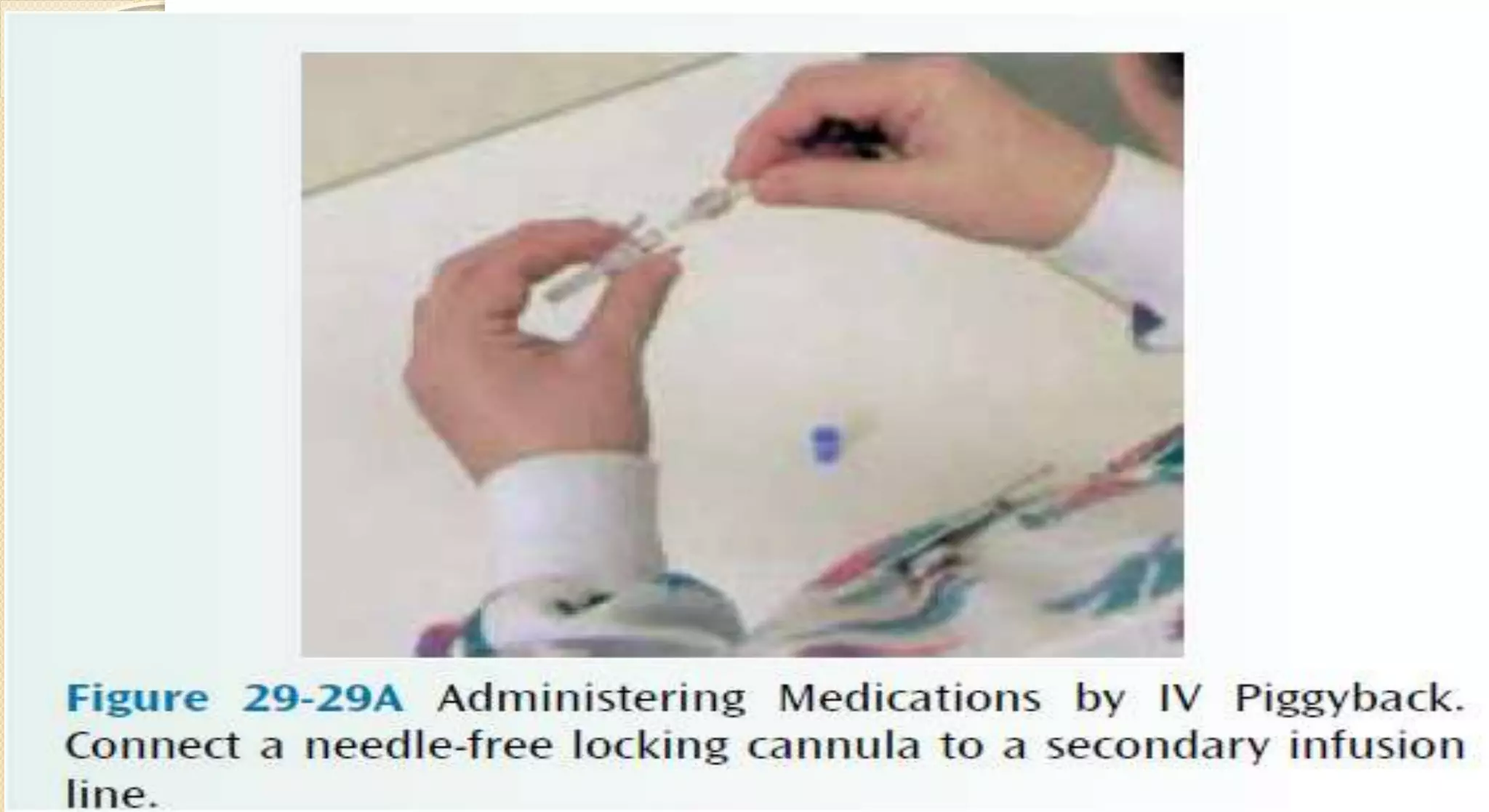 This document provides guidance on safely adding medications to intravenous lines and containers. It discusses assessing the intravenous site for complications before adding medications. Some key points covered include checking for drug compatibilities, using secondary bags or volume control sets to add compatible medications, flushing lines before and after to prevent incompatibilities, and administering intermittent or push injections through saline locks or into continuous lines while monitoring for reactions. The document emphasizes implementing the rights of medication administration and checking guidelines for each specific drug.