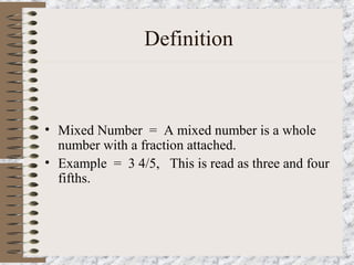 This document provides instructions for adding mixed numbers with like and unlike denominators. It defines a mixed number as a whole number with an attached fraction. To add mixed numbers with like denominators, add the fractions and then add the whole numbers. To add mixed numbers with unlike denominators, find a common denominator, convert the fractions to that denominator, add the fractions, and then add the whole numbers and combine the result.