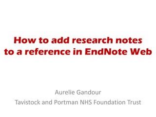 This document provides instructions for adding research notes to references in EndNote Web. It explains that you should log into your EndNoteWeb account, click on "All My References" or a group name to access references. Then click the title of the reference you want and "Show Empty Fields" to display the research notes field at the bottom, where you can enter notes that will be searchable along with the references in Quick Search.