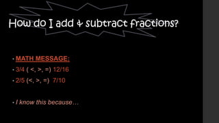 This document provides examples and instructions for adding and subtracting fractions. It includes worked examples using area models and number lines. Students are asked to practice adding and subtracting fractions using these methods. They are also asked to reflect on rules for working with fractions and explain mixed numbers and improper fractions to younger students.