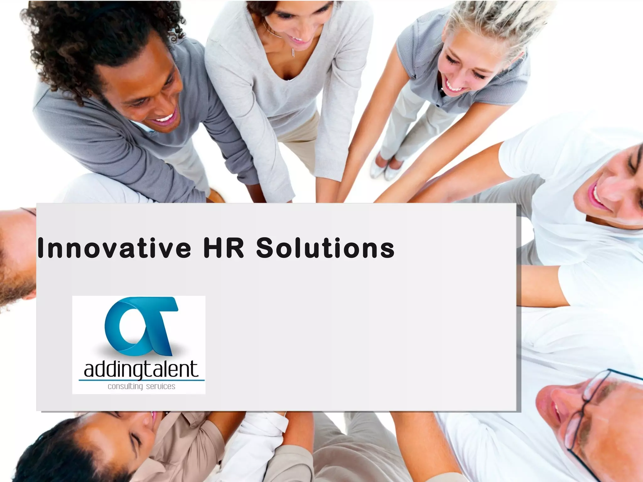 The document discusses an HR consulting and advisory service called Adding Talent. It provides solutions for attracting, engaging, and retaining talent including planning, sourcing, screening, assessing, recruiting, onboarding, training, and performance management. Adding Talent's services are targeted towards startups, small and medium businesses, and non-profits. It focuses on innovation in HR and aims to help clients grow and succeed through collaborative, cost-effective talent solutions.