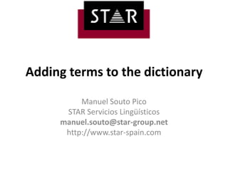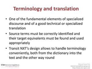 The document discusses adding terms to dictionaries for technical or specialized translation. Terms can be added by importing resources, manually entering them in Transit NXT's interface, or finding and adding terms as translation is done. Entering terms during translation has advantages like only needing to research terms once and improving consistency, quality, and productivity.