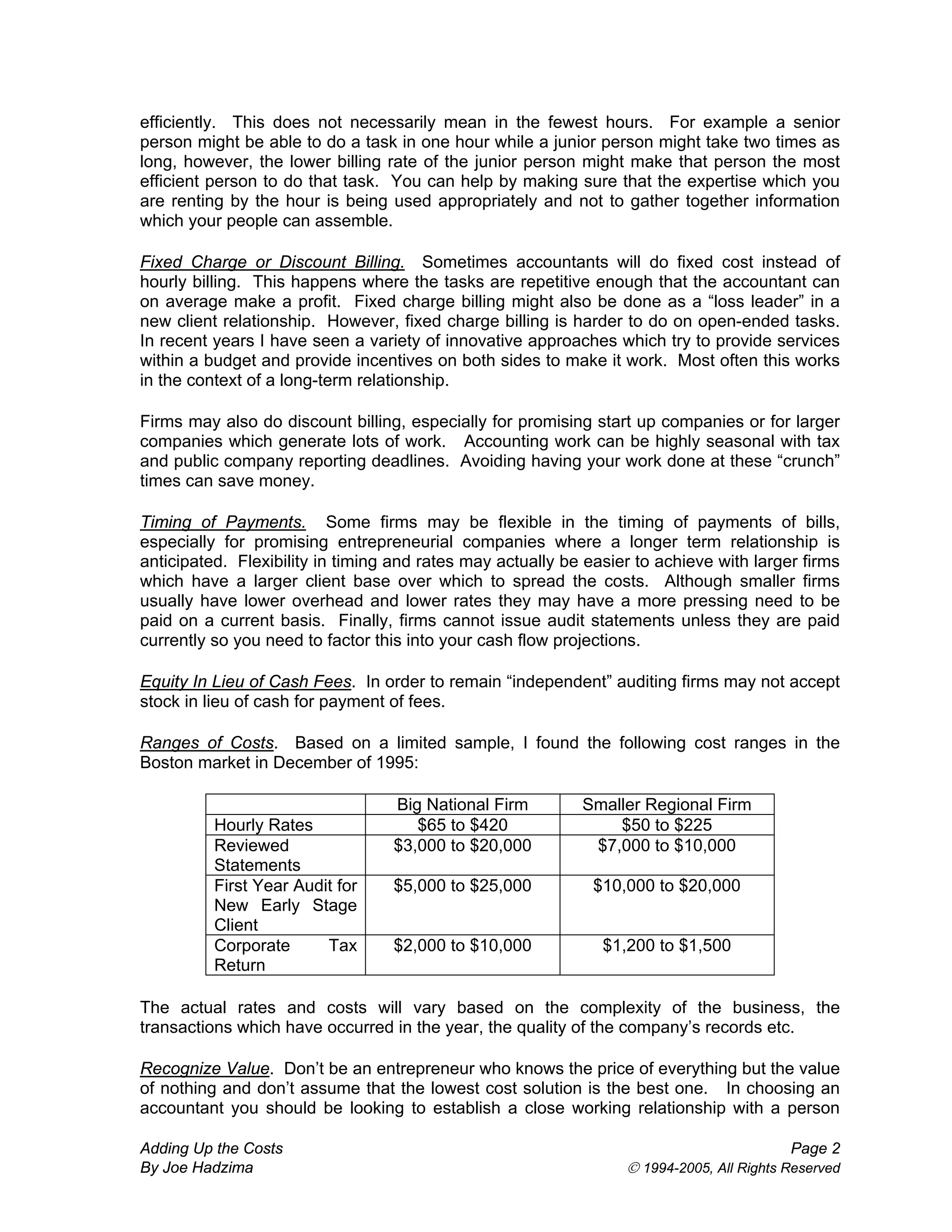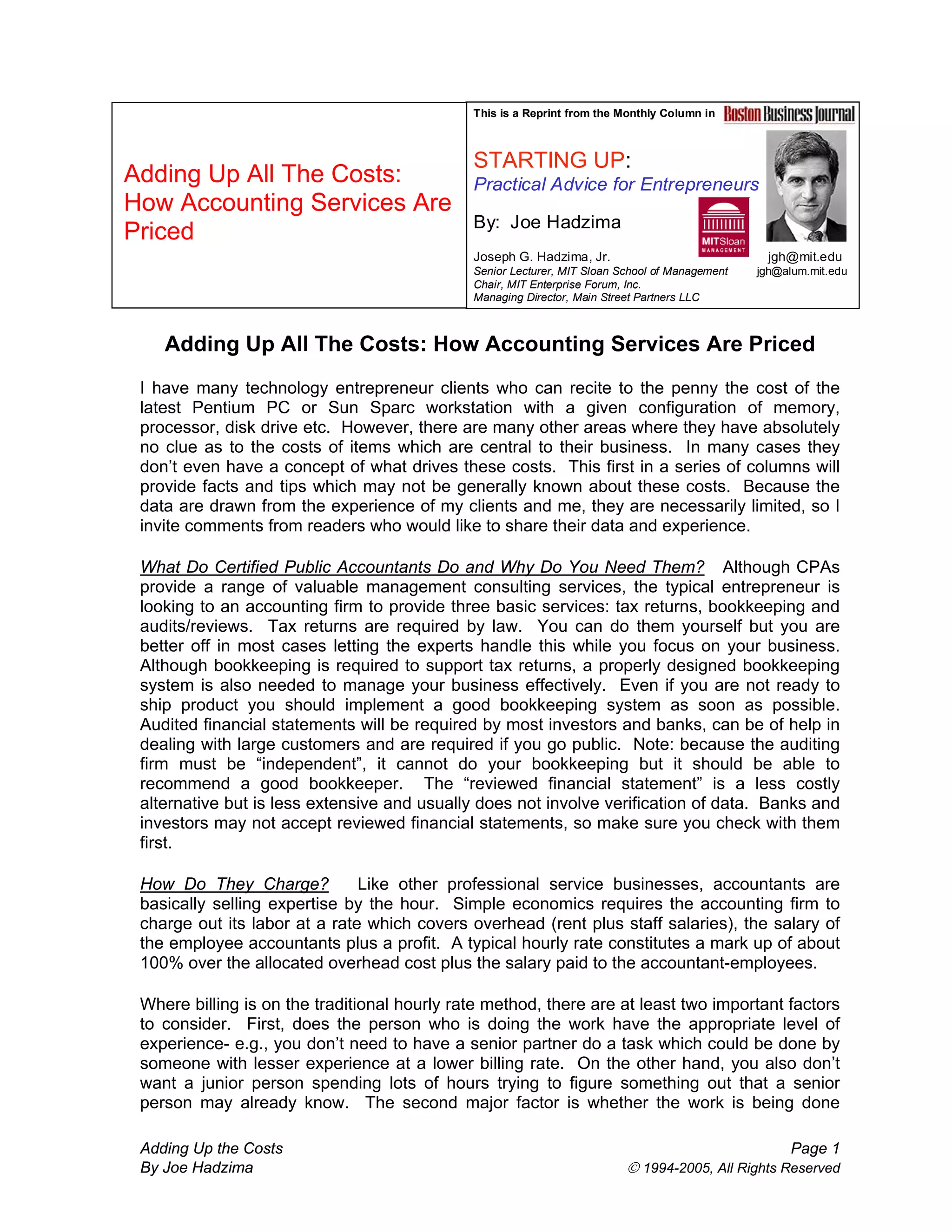 This document discusses how accounting services are priced. It explains that accountants typically charge hourly rates that cover overhead costs and salaries, with rates ranging from $50-420 per hour depending on firm size. Accountants provide tax preparation, bookkeeping, and audits/reviews. Costs for a reviewed financial statement range from $3,000-20,000, while a first year audit for an early stage company costs $5,000-25,000. The document provides tips for entrepreneurs to recognize value and get the most appropriate level of expertise for each task.