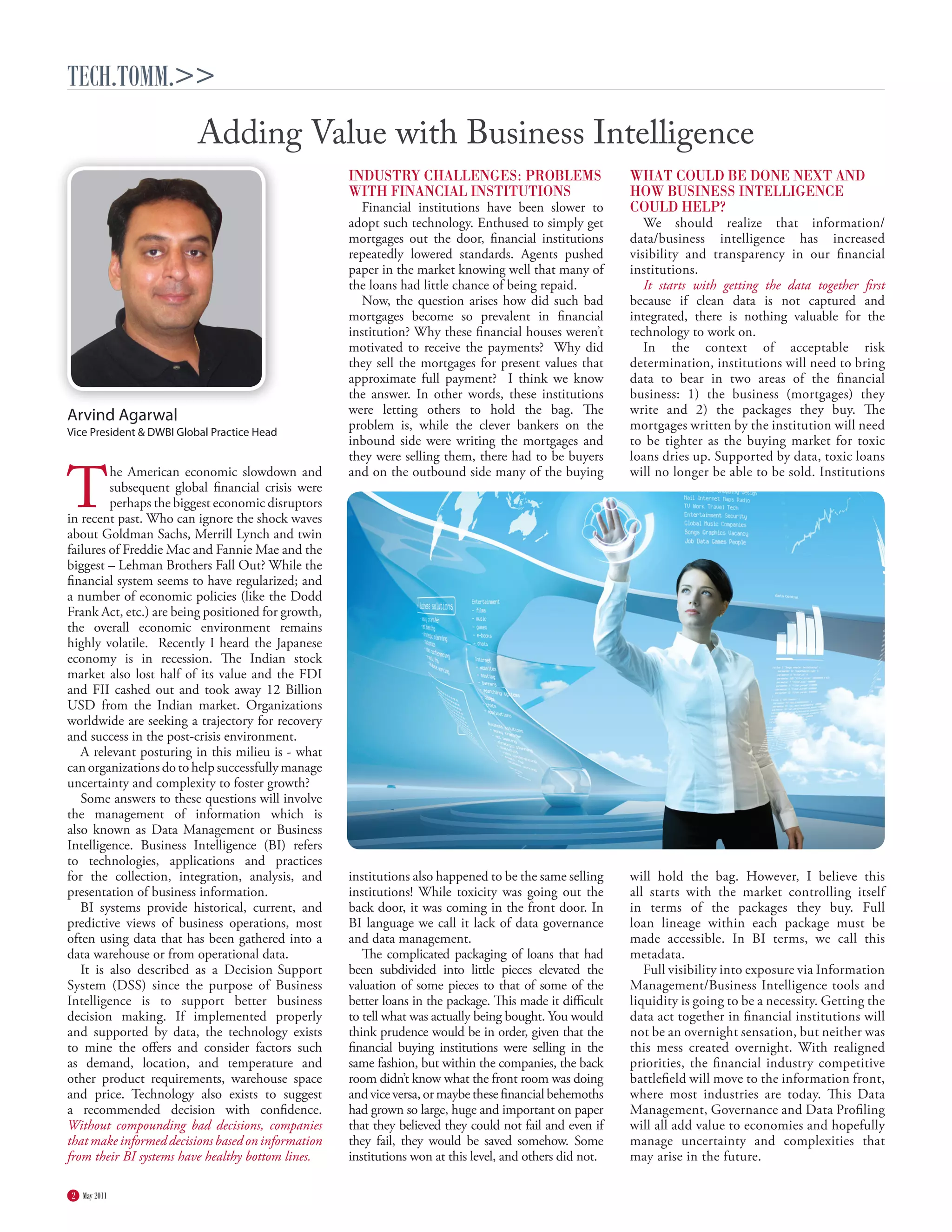 Financial institutions were slow to adopt business intelligence technology and lowered lending standards, contributing to the spread of toxic loans. Bringing data together through business intelligence can help institutions make better decisions by providing visibility into loan quality, risk exposure, and package contents. Clean, integrated data is needed to power these analytics and help the financial industry avoid similar crises in the future through improved data management, governance, and decision making.