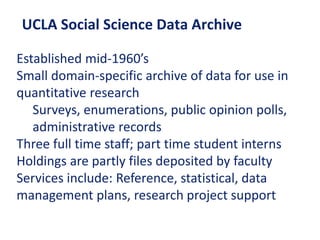 The document discusses the importance of data curation and management in social science research, highlighting the roles of organizations like UCLA's Social Science Data Archive and ICPSR in preserving, sharing, and managing research data. It emphasizes long-term access, data confidentiality, proper attribution, and the necessity of data management planning, detailing various methods to share sensitive information securely. Additionally, it mentions federal initiatives on data sharing and provides insights into researchers' attitudes towards sharing their data.