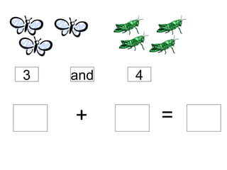 This document provides addition problems and their solutions for practicing addition skills. It lists 10 addition problems in the form of "x + y =", followed by the numbers being added and the sum, such as "3 + 4 = 7". The problems cover adding single-digit numbers together with results ranging from 4 to 9.