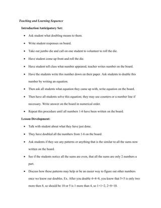 This lesson plan is about doubling numbers from 1 to 10. The 45 minute lesson will introduce doubling through rolling a die and writing equations. Students will then work in groups with dice, recording doubling equations. Patterns in doubled numbers will be discussed. Formative assessment includes observing students during discussion and modeling. Summative assessment over 8 days reviews colors through daily themed activities.