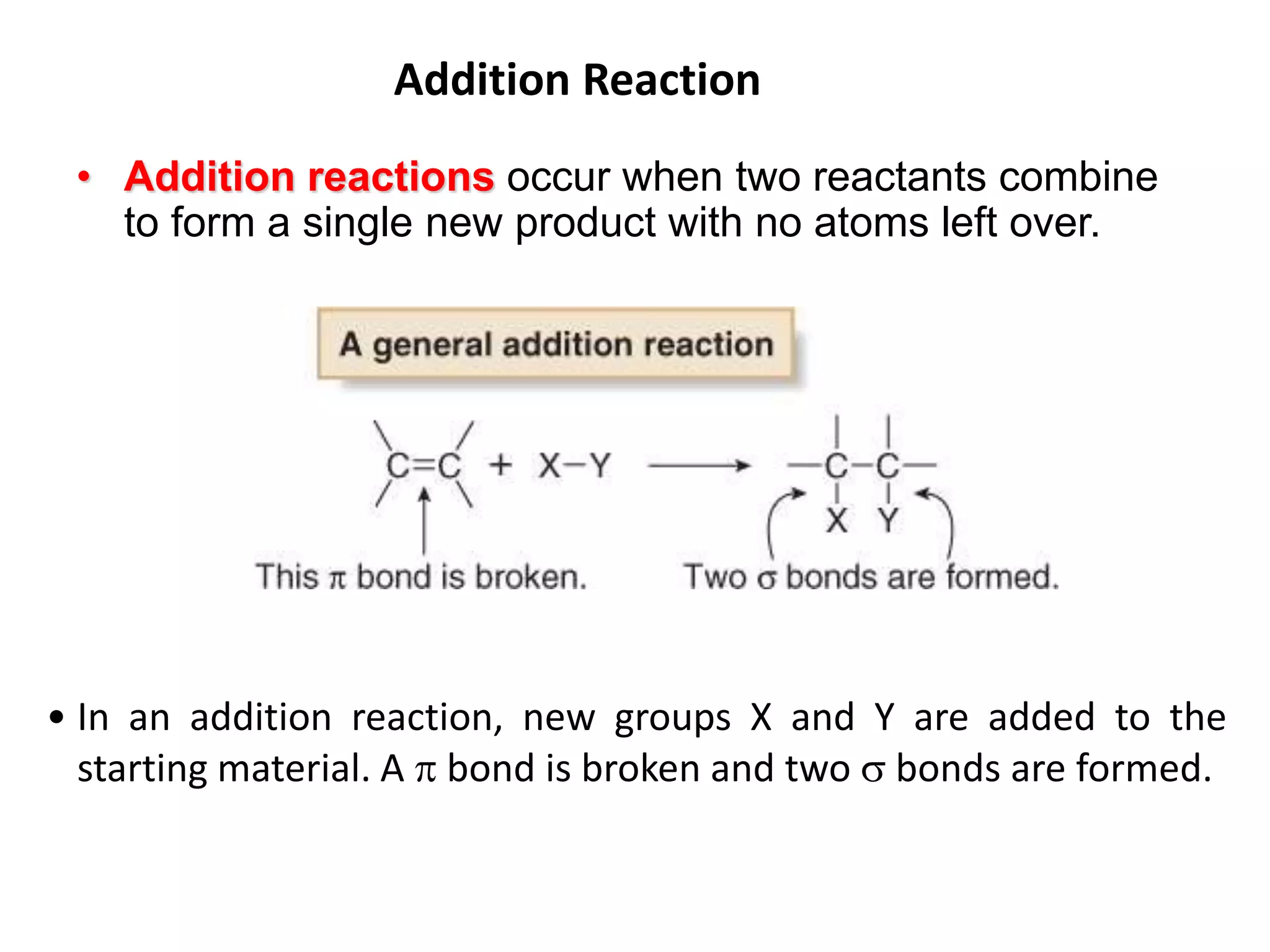 Addition reactions occur when two reactants combine to form a new product with no leftover atoms. In an addition reaction, new groups are added to the starting material, breaking a pi bond and forming two sigma bonds. Addition reactions involve the addition of electrophiles, radicals, or nucleophiles across multiple bonds such as carbon-carbon double or triple bonds.