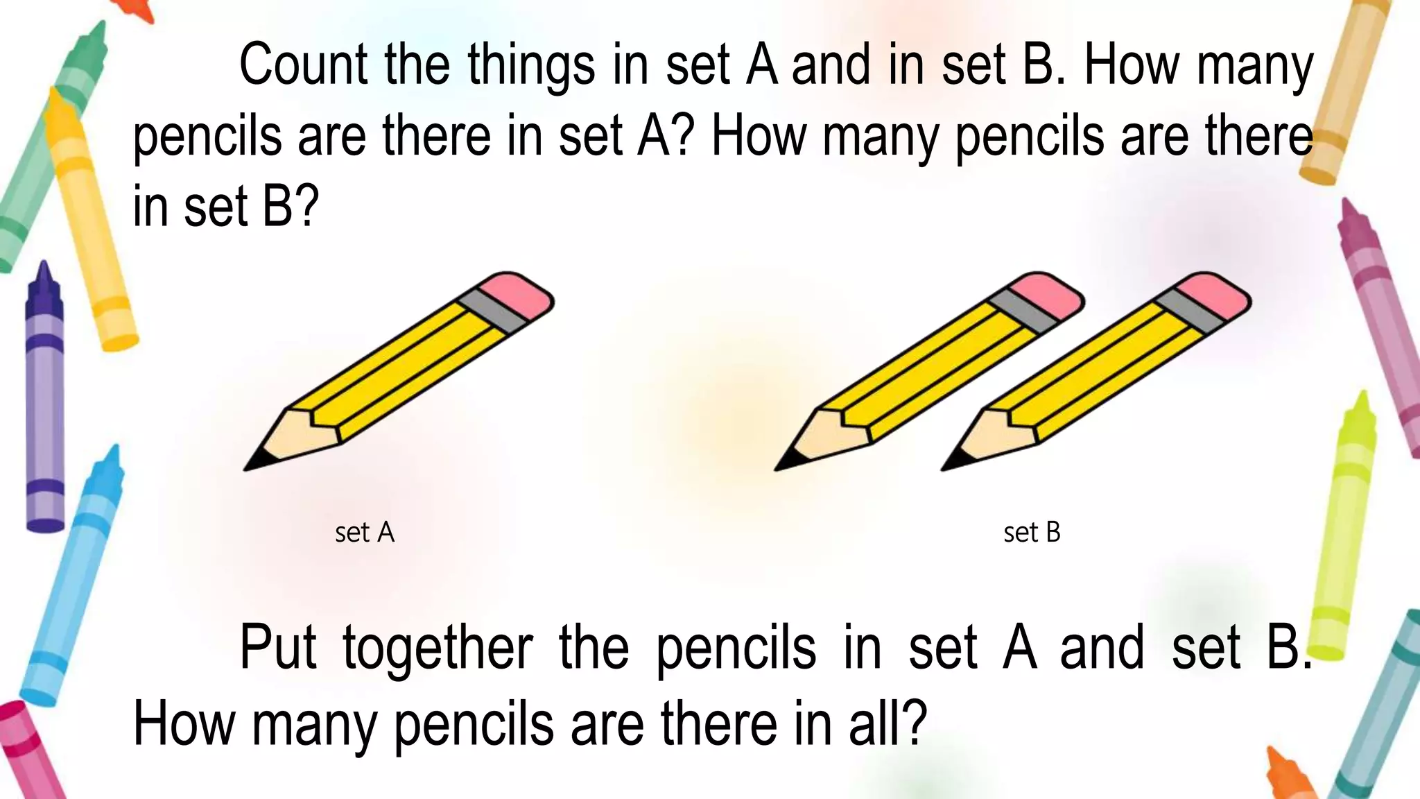 The document discusses addition with sums of 5 or less. It explains that addition is putting sets of items together to find the total amount. An example is given where set A has 1 pencil, set B has 2 pencils, and when they are combined there are 3 pencils total. The key parts of an addition sentence are identified as the numbers being added, the plus sign, the equal sign, and the sum.