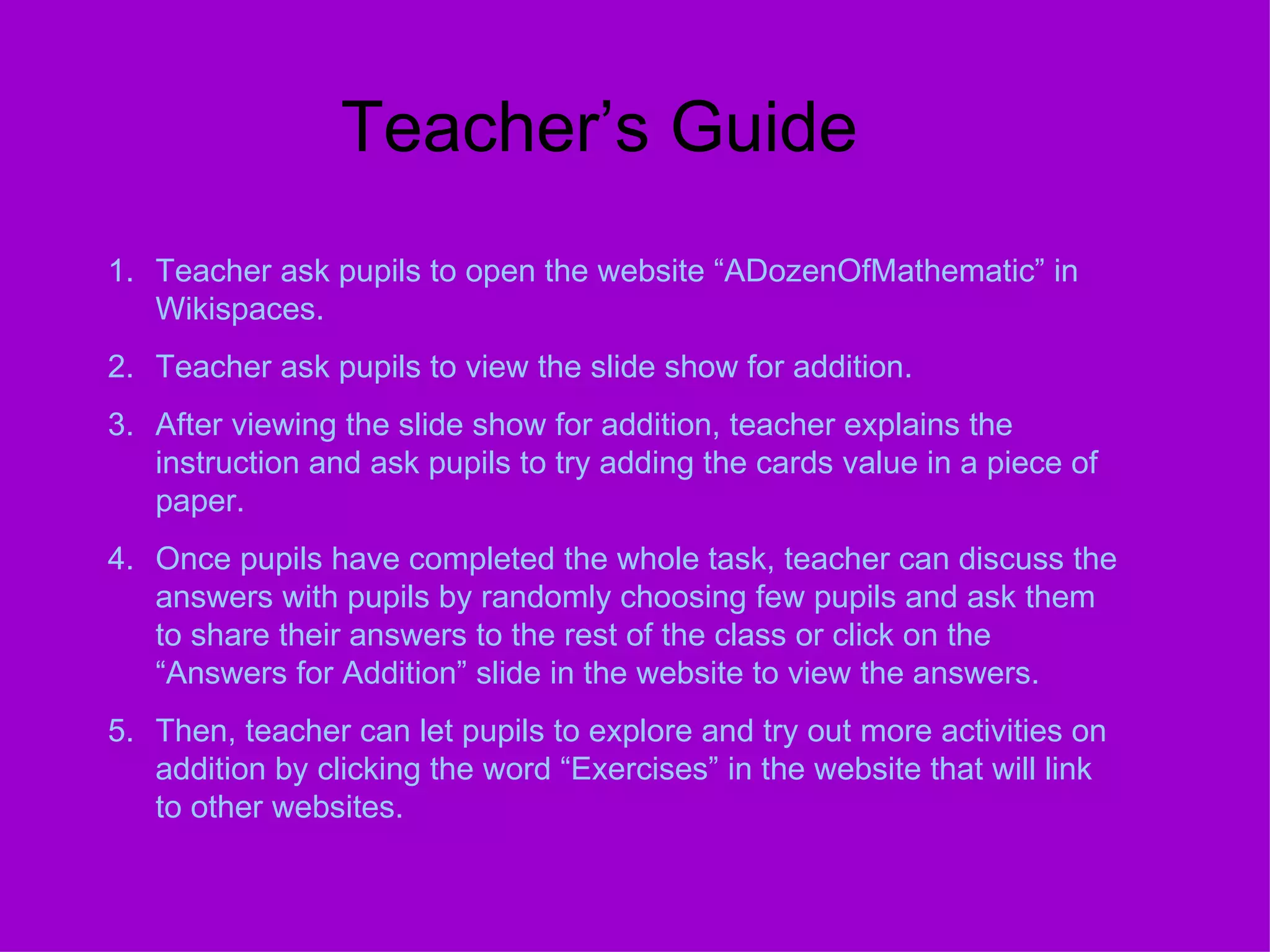 The teacher instructs pupils to view an online slideshow on addition. After viewing, the teacher explains how to add card values on paper. Once completed, the teacher discusses answers by calling on pupils or showing the slide with answers. Then, pupils can explore more addition activities by clicking exercises on the website.