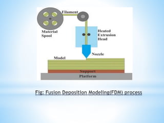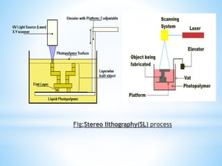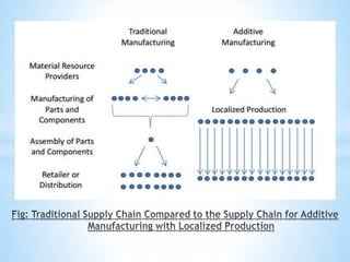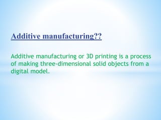 The document discusses additive manufacturing (3D printing) as a transformative technique for creating solid objects from digital models, contrasting it with conventional subtractive manufacturing. It highlights the advantages of additive manufacturing, including rapid prototyping, reduced material waste, and increased customization, while also acknowledging its limitations such as high production costs and slow build rates. Additionally, various processes like stereolithography (SL) and selective laser sintering (SLS) are explored, detailing how they function and their applications across industries like aerospace and medical instruments.