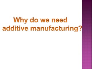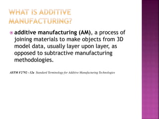 Additive manufacturing (AM) involves creating objects layer by layer from 3D model data, contrasting with traditional subtractive manufacturing. Common materials used in 3D printing include various plastics like ABS and PLA, as well as metals such as steel and titanium, with applications in diverse fields like medical, automotive, and education. The process typically begins with a design in CAD software, followed by printing, showcasing the versatility and innovation of modern manufacturing technologies.
