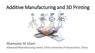This document provides an overview of additive manufacturing and 3D printing technologies. It discusses 3D printing versus traditional manufacturing methods and describes major 3D printing technologies including stereolithography, fused deposition modeling, selective laser sintering, and selective laser melting. Applications of 3D printing in healthcare, construction, and other fields are highlighted. The evolution of additive manufacturing toward 4D printing and self-assembling materials is covered. Challenges and opportunities in the development of 4D printing are identified.