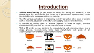 Additive manufacturing (AM) operates by adding layers of material together to make an object, unlike conventional manufacturing which subtracts material. AM allows for combining manufacturing and assembly into a single process. The main AM techniques are vat photopolymerization, material jetting, binder jetting, material extrusion, powder bed fusion, sheet lamination, and directed energy deposition. AM provides advantages like customization and reduced waste but also has limitations like roughness and cost. Current research focuses on areas like smart components and additive manufacturing of dissimilar materials.
