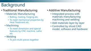 This document outlines the background, benefits, and processes of additive manufacturing (AM), contrasting it with traditional manufacturing. It details qualification and certification methods, categorizes various AM techniques, and emphasizes the advantages such as design freedom, cost-effectiveness, and the ability to produce complex shapes. The document also discusses challenges and provides information on implementation and continuous improvement in AM practices.